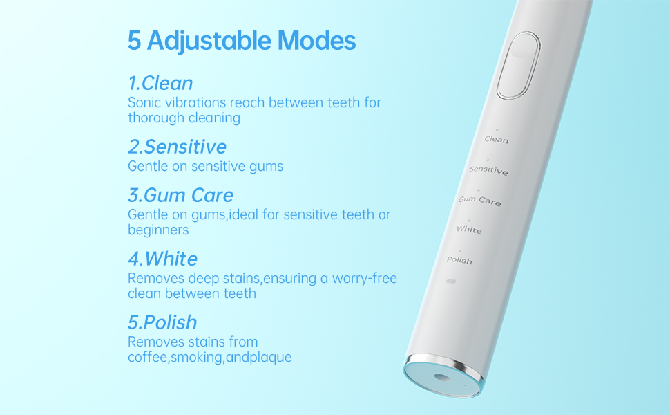 5 modes:Clean,Sensitive,White,Polish,Gum Care;